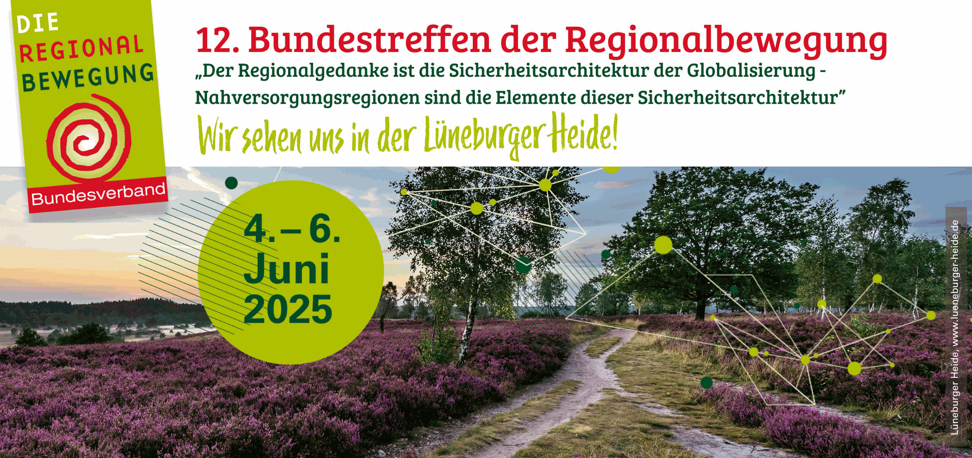 Unter diesem Leitthema lud der Bundesverband der Regionalbewegung e.V. zum 12. Bundestreffen in die Lüneburger Heide ein. Die Regionalbewegung diskutierte zentrale Fragestellungen zur Stärkung regionaler Strukturen und Lösungsansätze, wie eine dezentrale Land- und Ernährungswirtschaft zur Stabilität und Nachhaltigkeit von Nahversorgungsregionen, als Elemente der Sicherheitsarchitektur, beitragen kann. Dabei standen ebenso Natur-, Arten- und Gewässerschutz im Fokus: Naturparks als nationale Naturlandschaften bieten für regionale Wertschöpfungsketten Chancen.
