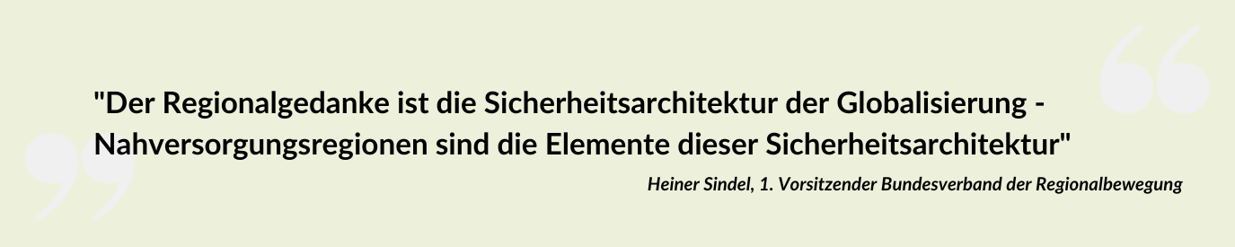 Der Regionalgedanke ist die Sicherheitsarchitektur der Globalisierung - Nahversorgerregionen sind die Elemente dieser Sicherheitsarchitektur und auch die Basis einer lebendigen Land-Stadt-Beziehung sowie das Fundament belastbarer Daseinsvorsorge. Klimaschutz durch kurze Wege der Arbeitsauftrag.