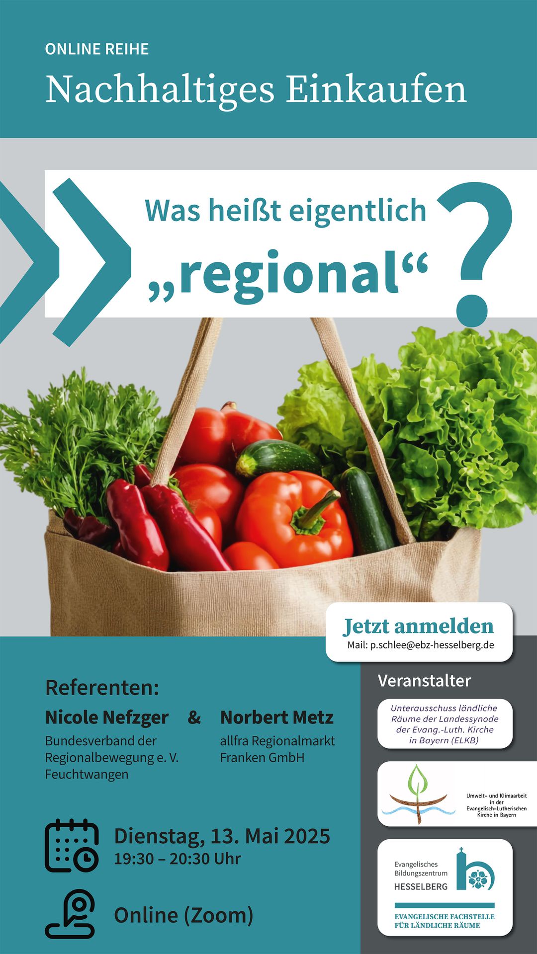 Die Landwirtschaft ist dabei ein prägender Faktor ländlicher Räume. Im Klimaschutzgesetz der Evang.-Luth. Kirche in Bayern werden daher Regelungen formuliert für eine nachhaltige Beschaffung von Lebensmitteln, um die Umwelt zu entlasten, einen Beitrag zum Klimaschutz zu leisten und die heimischen Erzeuger*innen zu stärken. Die Online-Seminarreihe „Nachhaltiges Einkaufen“ der Evang. Fachstelle für Ländliche Räume am Evangelischen Bildungszentrum Hesselberg möchte hierzu Anregungen und Impulse zu einer nachhaltigen Beschaffung von Lebensmitteln geben.