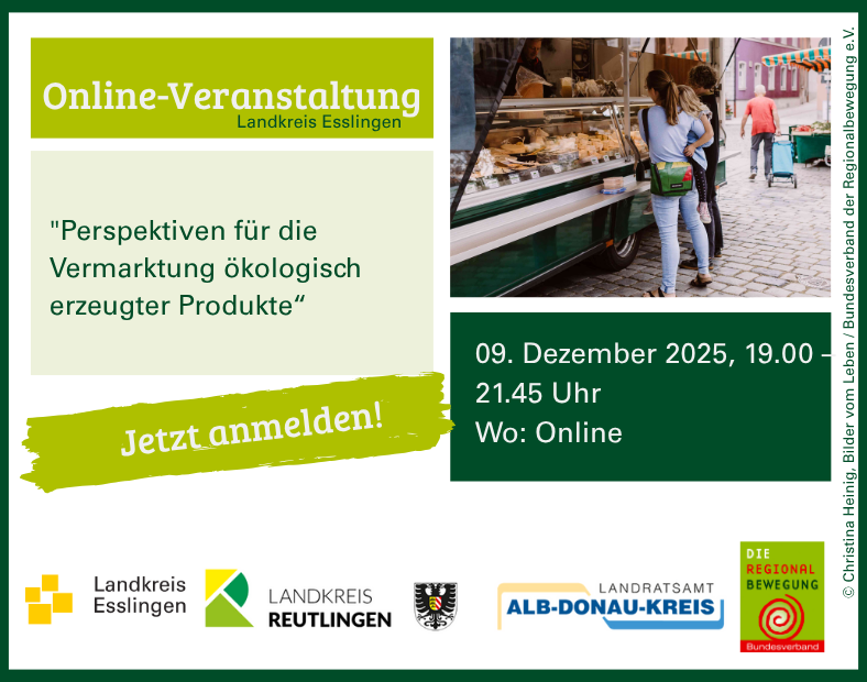Das Landwirtschaftsamt des Landkreises Esslingen, das Kreislandwirtschaftsamt Reutlingen und das Landwirtschaftsamt des Landratsamts Alb-Donau-Kreis laden hierzu gemeinsam alle Landwirt:innen zur Online-Veranstaltung „Perspektiven für die Vermarktung ökologisch erzeugter Produkte“ ein.