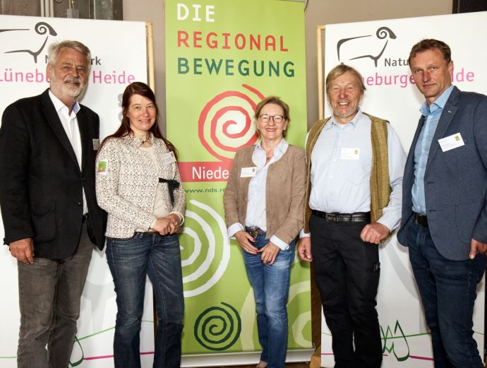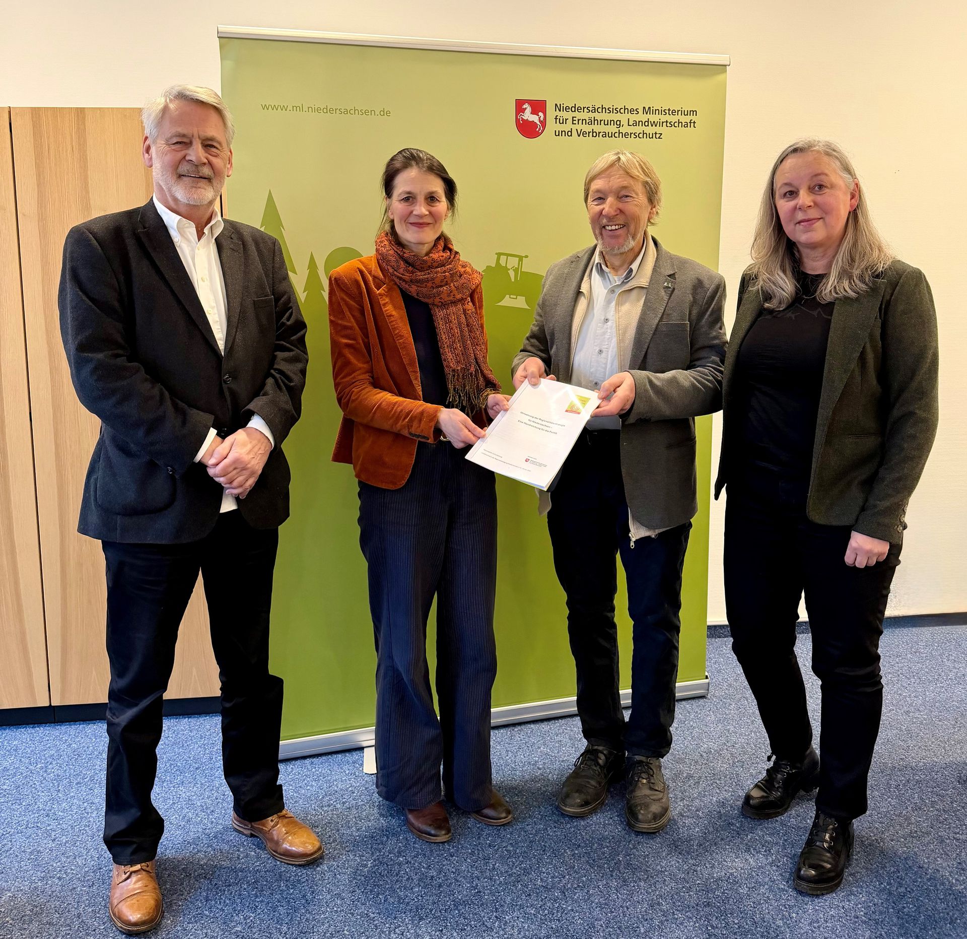 v.l.n.r.: Peter Wogenstein (Landesverband Regionalbewegung Niedersachsen e.V.), Miriam Staudte (Niedersächsische Ministerin für Ernährung, Landwirtschaft und Verbraucherschutz), Eberhard Ulrich-Prunzel (Landesverband Regionalbewegung Niedersachsen e.V.), Elke Eickemeier (Niedersächsische Ministerium für Ernährung, Landwirtschaft und Verbraucherschutz,Leiterin Referat 106).