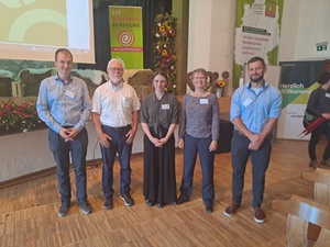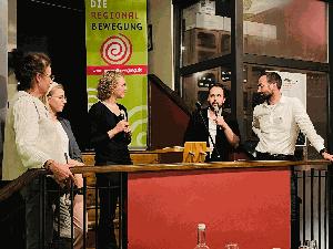 REGIOtalk (v. links): Moderator Stefan Gothe (Regionalwert Impuls GmbH) mit Judith Gerhold (UNSER LAND GmbH), Moritz Tapp ( Bundesvorstand BUNDjugend), Eberhard Prunzel-Ulrich, (BRB e.V.), Hubert Heigl (BÖLW)_Bild: Anton Brey