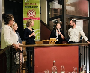 Erfolgreich regional wirtschaftende Betriebe sprachen über ihre mutmachenden Konzepte, aber auch über ihre Herausforderungen in der Praxis von Lebensmittelhandwerk und Regionalvermarktung (v.l.n.r.): Christine Bajohr (Allgäuer Bergbäuerin auf dem KugelSüdhangHof und Geschäftsführerin der AERA Land gGmbH); Alina Henrici (Geschäftsführerin Metzgerei Henrici), Anna-Lena Buchholz (Projektleiterin Regionalbewegung), Max Goldberg (Küchenchef und Restaurantleiter des irori Restaurants) und Stephan Hirsch (Inhaber von HHMMXX Farm.Food.Fitness)