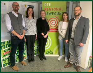 Intensiver Austausch zu den Chancen einer Regionalisierung in der Land- und Ernährungswirtschaft (v.l.n.r.): Hermann Färber (MdB und Ausschussvorsitzender des EL-Ausschuss im Bundestag), Dr. Ophelia Nick (Parlamentarische Staatssekretärin im BMEL), Ilonka Sindel (Geschäftsführerin Regionalbewegung), Heiner Sindel (1. Vorsitzender Regionalbewegung), Dr. Marc Kaninke (Vorstand Landwirtschaftliche Rentenbank) und Anna-Lena Buchholz (Projektleiterin Regionalbewegung)