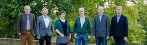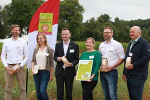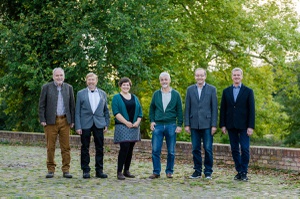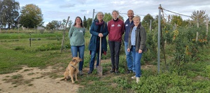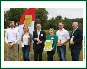 Tauschten sich intensiv über Herausforderungen und Potenziale des regionalen Kichererbsenanbaus aus, vlnr.: Prof. Dr. Peter Breunig (HSWT), Prof. Dr. Franziska Wespel (HSWT), Bezirkstagspräsident Peter Daniel Forster (Bezirk Mittelfranken), Nicole Nefzger (BRB e.V.), Ulrich Lohmüller (LLA Triesdorf), Waldemar Hein (Landwirt).