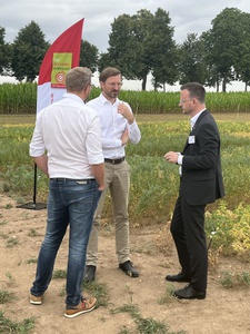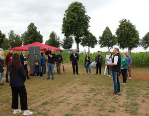 Teilnehmende der Fachexkursion lauschen auf dem Kichererbsenacker dem Grußwort von Ulrich Lohmüller (LLA Triesdorf).