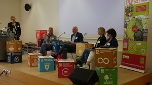 Forum REGIOlogistik (v. links): Alexander Treml (Regiothek GmbH), Wendelin Abresch (Wällermarkt eG), Anna Messerschmidt (Bezirksdialog Steglitz-Zehlendorf), Dr. Susanne Hofmann-Souki (TU Berlin), Josef Harrasser (CENTOURIS)