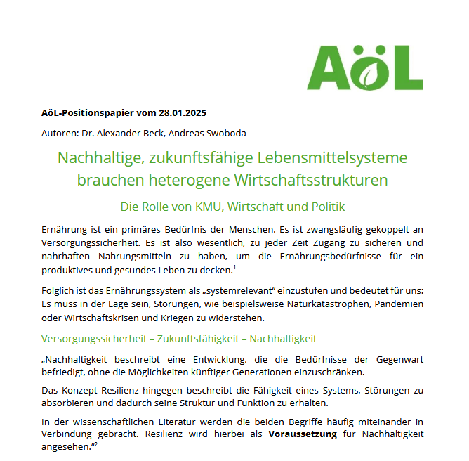 Die Assoziation ökologischer Lebensmittelherstellerinnen und -hersteller e.V. (AÖL) zeigt in ihrem Positionspapier Lösungsstrategien für eine mittelstandstaugliche Lebensmittelbranche auf, um die Versorgungssicherheit im Ernährungssystem nachhaltig und resilient zu gestalten.