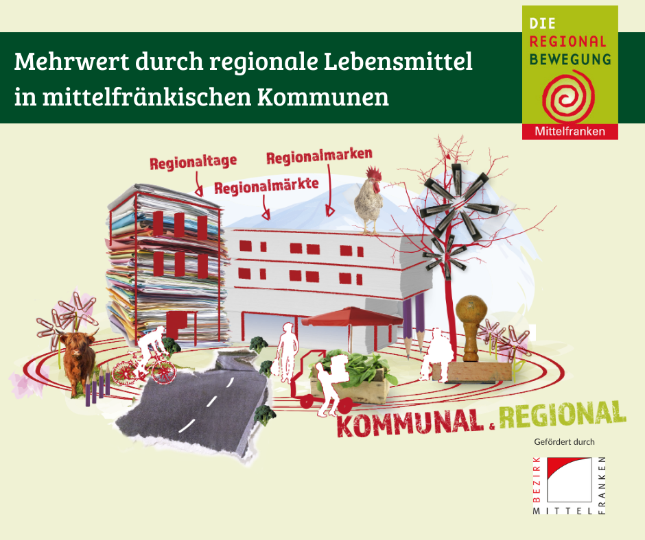 In der vom Bezirk Mittelfranken geförderten „Informations-, Kommunikations- und Qualitätsoffensive für MehrWert durch den Einsatz regionaler Lebensmittel in mittelfränkischen Kommunen“ setzte die IG Regionalbewegung Mittelfranken daran, die kommunalpolitische Arbeit für den Bereich Ernährung mit regionalen Lebensmitteln zu unterstützen. Im Fokus standen Handlungsempfehlungen zur Verwendung regionaler Lebensmittel in kommunalen Einrichtungen selbst und Hilfestellungen zur Sensibilisierung der Bevölkerung für eine stärkere Nachfrage nach regionalen Lebensmitteln. Für klimagerechte Landkreise, Städte und Gemeinden sowie starke Nahversorgungsregionen ist die lokale Ernährungswirtschaft, welche alle Bereiche von landwirtschaftlicher Produktion über Verarbeitung, Logistik und Vertrieb bis hin zu Konsum von Lebensmitteln und Verwertung von Abfällen umfasst, ein zentrales Handlungsfeld.